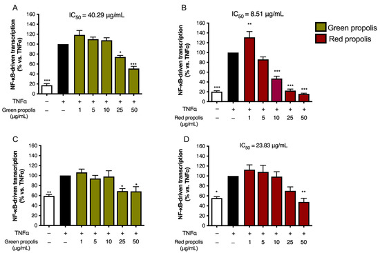 Assessment of green (A,C) and red (B,D) Brazilian propolis effect on NF-κB-driven transcription in HaCaT (A,B) and HDF (C,D) cells. Cells were stimulated with 10 ng/mL of TNF-α and treated for 6 h with increasing propolis concentrations. EGCG 20 μM was used as a reference inhibitor (−77%). Data are expressed as a percentage of the stimulus, which was arbitrarily assigned the value of 100%. − means “present” and + means “absent”. * p < 0.05, ** p < 0.01, and *** p < 0.001 versus TNF-α.