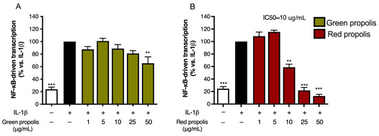 For this purpose, cells were transiently transfected with an NF-κB-Luc reporter plasmid, subjected to the pro-inflammatory stimulus, TNF-α or IL-1β (10 ng/mL), and concomitantly treated with increasing concentrations of Brazilian propolis (1–50 μg/mL).