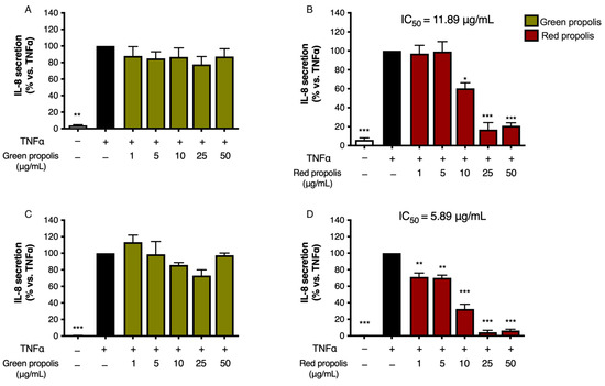 The NF-κB pathway is implicated in the downstream modulation of the expression of several inflammatory chemokines and cytokines, including IL-8 and IL-6. IL-8 and IL-6 are expressed in the cutis during inflammation, but an excessive or prolonged secretion is correlated with the chronicization of cutaneous injuries [53]. In line with NF-κB impairment, red propolis exerted a significant inhibitory effect on IL-8 release in both HaCaT and, to a greater extent, HDF cells under TNF-α pro-inflammatory stimulation, thus confirming the anti-inflammatory properties previously inferred (Figure 6). On the other hand, a limited or no effect was seen in the case of green propolis. Once again, the greater efficacy of red propolis emerging from these results is probably associated with the higher phenolic content and especially with the presence of flavonoids [54].
