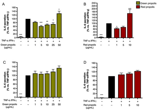 After 72 h of growth, HaCaT and HDF cells were treated with different concentrations of green and red propolis extracts using a serum-free medium. Concomitantly, cells were stimulated with the pro-inflammatory cytokines TNF-α or IL-1β (10 ng/mL) for 6 h or 24 h. Moreover, according to previously published methodologies [35], IL-6 production was evaluated by adding the inflammatory enhancer IFN-γ (5 ng/mL) to TNF-α. Following previous works, 20 μM of epigallocatechin gallate (EGCG) was used as a reference inhibitor against TNF-α, while 1 mM of DMOG was used as a reference inhibitor against IL-1β.