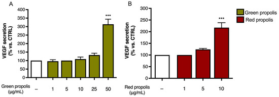 Surprisingly, both propolis samples were able to increase the expression of the IL6 gene in basal conditions (Figure 8), paralleled by an increase in cytokine secretion levels only in the presence of a pro-inflammatory stimulus (Figure 7) but not in the absence of stimulation. This is particularly interesting considering that the favorable involvement in the initial phases of cutaneous repair of IL-6, which exerts a proliferative effect on keratinocytes, is a chemoattractant for neutrophils, and may play a role in collagen deposition and angiogenesis [42]. Notably, previous research demonstrated that IL6 knockout mice present a significant delay in wound healing [43]. We further noticed that Brazilian green and red propolis can enhance VEGF expression in HaCaT cells (Figure 8 and Figure 9). These results are concordant with published studies ascribing wound healing properties to polyphenols featuring antioxidant effects and promoting activity on growth factors such as VEGF [55]. Moreover, they are in line with other works supporting the wound healing properties of Brazilian propolis [19,20,21]. Notably, these modulatory effects on inflammatory mediators were paralleled by the reduction in ROS levels, which, again, suggested a favorable antioxidant activity in tissue remodeling (Figure 10).