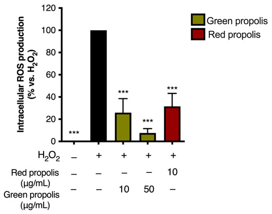 ROS production was investigated in HaCaT cells seeded in 96-well black plates, as previously described [36]. At the end of 24 h pretreatment with propolis extracts, cells were washed with warm PBS and incubated at 37 °C with 25 μM CM-H2DCFDA (Invitrogen, Thermo Fisher Scientific, Monza, Italy) in HBSS without phenol red (Merck Life Science, Milano, Italy). After 30 min, cells were washed twice with PBS and treated for 1 h with H2O2 (1 mM) in serum-free medium. Following 1 h of incubation, cells were washed again with PBS, and 100 μL of PBS was added to each well; finally, fluorescence was read using a multiplate reader (VICTOR X3; PerkinElmer, Milano, Italy) at Ex. = 490 nm/Em. = 535 nm.