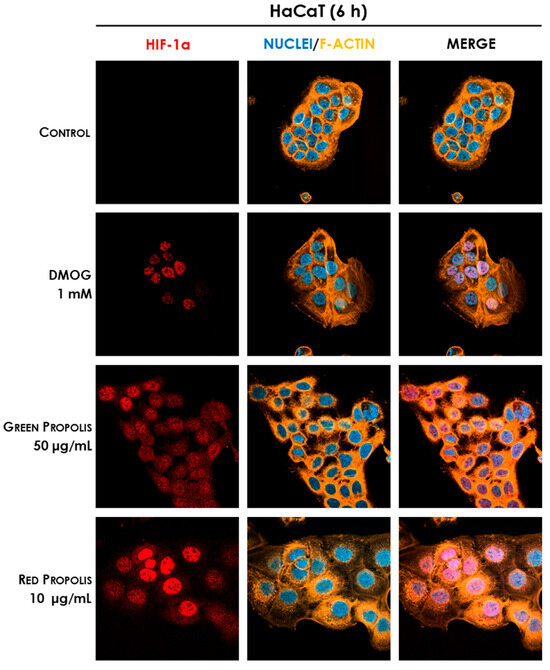 Thus, the final part of our work was aimed at demonstrating the plausible involvement of HIF-1 in the mechanisms of action previously elucidated. Initial screening immunocytochemistry experiments have demonstrated that both propolis samples are able to induce the stabilization and nuclear translocation of HIF-1α in HaCaT cells, while only red propolis seems to be active at 24 h in HDF cells (Figure 11, Figure 12, Figure 13 and Figure 14). These results showed a greater activity of green propolis in HaCaT cells and reconfirmed that, in HDF cells, only red propolis is active and at longer time points. Notably, in HDF cells, the effect on HIF-1α stabilization appeared temporally disjoint from that of the reference compound DMOG, thus suggesting different underlying molecular mechanisms.