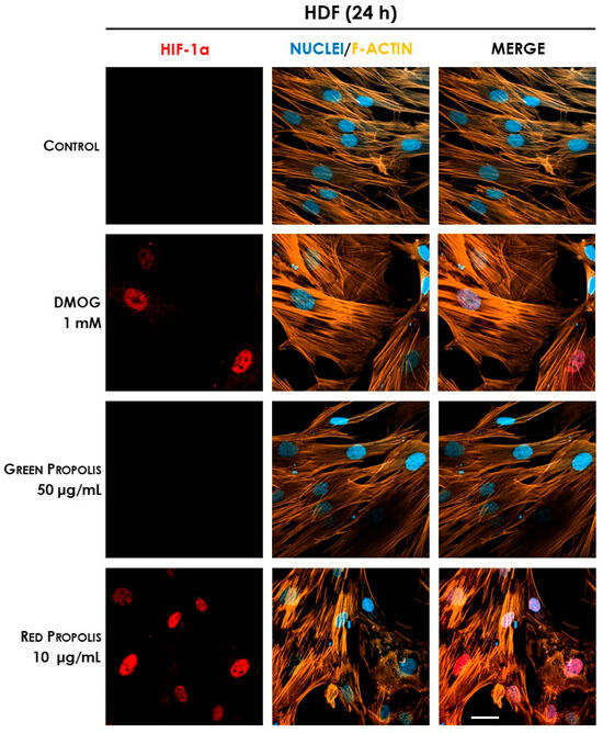 Representative confocal micrographs of the fluorescent immunostaining of HIF-1α (red) to assess the effect of Brazilian propolis on HIF-1α stabilization and nuclear translocation in HDF cells after 24 h of treatment (magnification 60×, 50 μm scale). Nuclei were stained with DAPI (blue), whereas F-actin was stained with TRITC-phalloidin (orange).