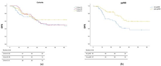 Three-year OS showed values of 72%, 76%, and 68% for Cohort A, B, and C, respectively (p = ns). Univariate analysis of OS demonstrated a significantly better outcome in patients with clinically node-negative (cN0) disease (p < 0.001). A trend toward improved OS was also observed in patients achieving pathologic nodal complete response (ypN0), although this did not reach statistical significance (p = 0.071). Detailed univariate analysis results concerning three-year DFS and OS are presented in Table 3.