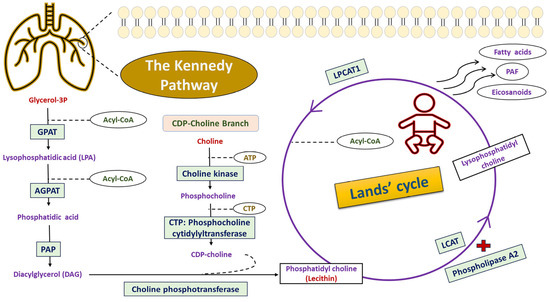 The main constituent of pulmonary surfactant is saturated phosphatidylcholine (PC) that primarily encompasses dipalmitoyl-phosphatidylcholine (DPPC)—commonly known as lecithin. It is responsible for lowering surface tension, along with other remaining components including palmitoyl-myristoyl-phosphatidylcholine (PMPC), palmitoyl-palmitoleoyl-glycero-phosphocholine, cholesterol, phosphatidylglycerol, and surfactant polypeptides [14,15]. The metabolic biosynthesis of phosphatidylcholine is a sophisticated process that requires two fundamental processes: the de novo mechanism (Kennedy pathway) and the remodeling pathway (Lands’ cycle), as illustrated in (Figure 1) [16,17]. These metabolic processes are essential for the synthesis of multiple phospholipids, the maintenance of structural integrity of cellular membranes, and the generating of lipid precursors such as platelet-activating factors and eicosanoids [18]. Briefly, the Kennedy pathway initiates with the biosynthetic process of lysophosphatidic acid (LPA) through the condensation of glycerol-3-phosphate and acyl-CoA by the action of glycerol-3-phosphate acyltransferases (GPAT) [17,19]. LPA is then converted to phosphatidic acid using the enzymatic reaction of acylglycerol phosphate acyltransferases (AGPAT) [20,21]. This is followed by the dephosphorylation of phosphatidic acid to diacylglycerol (DAG), catalyzed by phosphatidic acid phosphatase (PAP) [22]. Additionally, the primary mechanism within this de novo mechanism involves the biosynthetic reactions of phosphatidylcholine through the CDP-choline branch [23]. The initial reaction is choline phosphorylation that is catalyzed by choline kinase yielding phosphocholine, while the subsequent enzymatic reaction is mediated by CTP: Phosphocholine cytidylyltransferase, resulting in the production of cytidine diphospho-choline (CDP-choline) [24]. Lastly, the third reaction is activated by the action of the choline phosphotransferase enzyme that catalyzes the formation of phosphatidylcholine from CDP-choline and DAG [23,24].