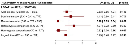 The inheritance association models for the LPCAT1 (rs9728; c.*1668T>C) variant with the susceptibility to NRDS are illustrated in Table 4. Our findings indicated that the LPCAT1 (rs9728; c.*1668T>C) variant provided reduced risk against NRDS development. RDS neonates carrying the double C allele within the homozygote contrast disclosed a significant association with a 78% decreased risk of NRDS (OR = 0.22, p = 0.027). However, after Bonferroni correction, the C/C genotype no longer reached the corrected significance threshold (p < 0.01), whereas the overall recessive and homozygous models remained significant. Considering the recessive model, RDS neonates carrying the rs9728*C/C genotype conferred reduced susceptibility against the development of NRDS (OR = 0.18, p = 0.002).