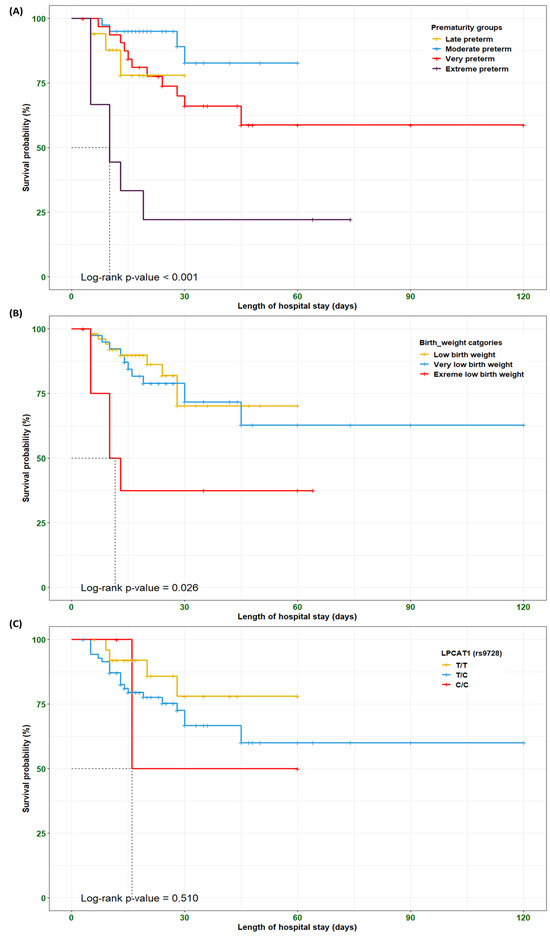 Kaplan–Meier curve of overall survival of RDS preterm neonates clustered based on (A) prematurity groups, (B) birth weight categories, and (C) LPCAT1*rs9726 genotypes. The log-rank p-value test was employed to compare the survival probability (%) of RDS preterm neonates based on the length of hospital stay.