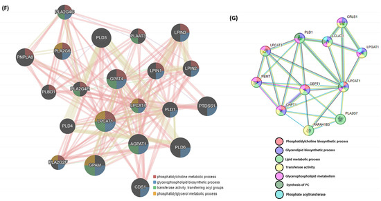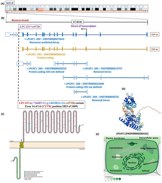 The computational bioinformatic frameworks for the LPCAT1 gene and their protein interactions are displayed in Figure 4. Based on the GRCh38.p14 genome building assembly, the human LPCAT1 gene (ENSG00000153395; other synonyms include FLJ12443, AGPAT9, AGPAT10, and LPLAT8) is situated on the shortened arm of the chromosome number 5p15.33 and transversed along the reverse strand for about 67,483 bases (Chr.5:1,456,480–1,523,962). Interestingly, the LPCAT1 (rs9728; c.*1668T>C) variant was identified within the last exon at the 3′ untranslated region (3′ UTR). This potential gene has six splice transcripts with the independent transcript (LPCAT1-201; ENST00000283415) that included fourteen coding exons and thirteen introns (https://www.ensembl.org/). Although VarSome classifies rs9728 as benign, various bioinformatic tools suggest that the variant may alter miRNA binding motifs and potentially affect LPCAT1 transcript stability. The coding regions in this gene encoded about 534 amino acid residues (https://wlab.ethz.ch/protter/). The subcellular localization database for annotated proteins confirmed the availability of the LPCAT1 enzyme in the endoplasmic reticulum, lysosomes, and Golgi apparatus with considerable abundance (https://compartments.jensenlab.org/). The predicted genomic annotation was evaluated using the GeneMANIA database to identify the functional analysis and genetic localization of the LPCAT1 gene with multiple metabolic reactions involving phosphatidylcholine metabolic processes, glycerophospholipid biosynthetic processes, transferring acyl groups, and phosphatidylglycerol metabolic processes (https://genemania.org/). Finally, the analysis of protein–protein interactions demonstrated how this crucial enzyme contributes to phosphatidylcholine biosynthesis, lipid biosynthetic processes, transferase activity, glycerophospholipid metabolism, and phosphate acyltransferase (https://string-db.org/). All these electronic databases were accessed on 26 April 2025.
