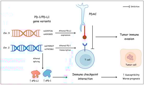 The programmed cell death protein-1 (PD-1) and its ligand PD-L1 are key components in regulating immune responses [10]. PD-1, a receptor expressed on the surface of T cells, interacts with PD-L1, which is abundant on tumor cells. This interaction suppresses T cell activity, enabling cancer cells to evade the immune system [11]. Variations in the PD-1 and PD-L1 genes may affect transcription, mRNA stability, or protein expression levels, thereby altering the functional activity of the PD-1/PD-L1 immune checkpoint pathway. For instance, certain polymorphisms may enhance or reduce PD-1 expression on T cells or alter PD-L1 expression on tumor cells, impacting the immune system’s capacity to attack cancer [12]. This indicates that an individual’s genetic makeup could affect the susceptibility to malignancy, aggressiveness of disease, and the patient’s response to therapy. Therefore, understanding these genetic relationships holds essential clinical ramifications. It paves the way for the development of more personalized treatment regimens, where therapies are tailored to fit the genetic profiles of patients [13]. To explore this relationship, we focused on investigating specific SNPs in PD-1 and PD-L1 genes selected for their established functional roles and associations in other malignancies. The PD-1 SNP rs7421861(intronic) has been linked to altered risk in esophageal, colorectal, hepatocellular, and lung carcinomas [14,15,16,17]. For PD-L1, we analyzed two SNPs within its 3’ untranslated region (3’UTR) of the CD274 gene on chromosome 9p24, a key regulatory region for mRNA stability and translation: rs4143815, which disrupts a binding site for the tumor suppressor miR-570, up-regulating PD-L1 expression and increasing the risk of multiple malignant disorders [18,19], and rs2297136, which has been associated with cancer prognosis and is predicted to affect miRNA binding [20]. An additional PD-1 variant, rs6749527, was included to provide broader coverage of the gene. Examining these functionally relevant polymorphisms offers a targeted approach to understanding how genetic variation in immune checkpoints influences PDAC susceptibility and progression (Figure 1).