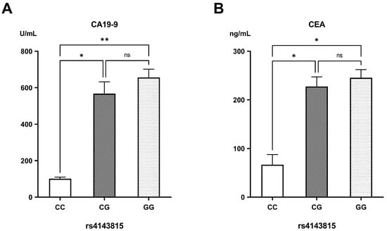 Levels of (A) carbohydrate antigen 19-9 (CA19-9) and (B) carcinoembryonic antigen (CEA) in the different genotypes of rs4143815. ns: non-significant difference; * significant difference with p < 0.05; ** significant difference with p < 0.01.