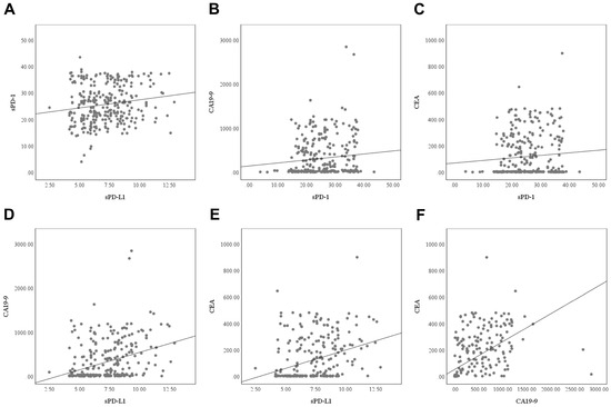 Scatterplot diagrams showing the correlations between (A) soluble PD-1 (sPD-1) and soluble PD-L1 (sPD-L1), (B) carbohydrate antigen 19-9 (CA19-9) and sPD-1, (C) carcinoembryonic antigen (CEA) and sPD-1, (D) CA19-9 and sPD-L1, (E) CEA and sPD-L1, (F) CEA and CA19-9.