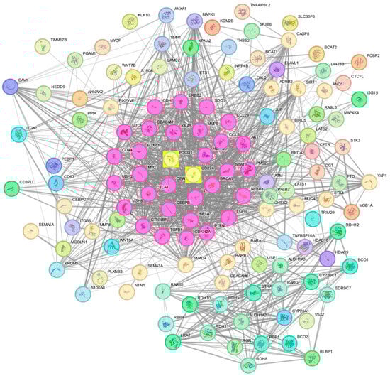 STRING Protein–protein interaction analyses. The network has 1194 edges (vs. 526 expected edges); enrichment p-value < 0.0001; clustering coefficient: 0.651. The thickness of the connecting edges denotes the strength of interaction. The middle yellow squares represent the two genes of interest connected to their neighboring genes.