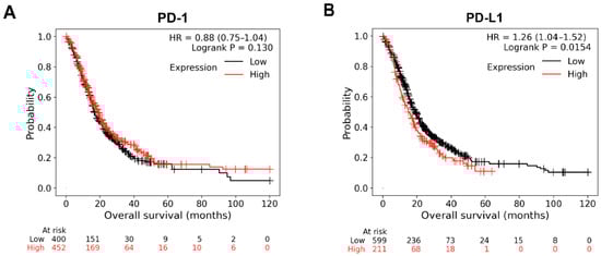 Based on Kaplan–Meier plots, patients were divided into a high-expression group and a low-expression group according to the median expression value. The Overall Survival (OS) curves of PD-1 and PD-L1 genes were plotted. The OS curves revealed that high expression levels of PD-1 showed no significant change in OS, while high levels of PD-L1 were associated with lower OS at p = 0.015 (Figure 7A,B). Median survival in the high expression of PD-L1 showed 15 months of survival vs. 19.07 months in the low expression cohort.