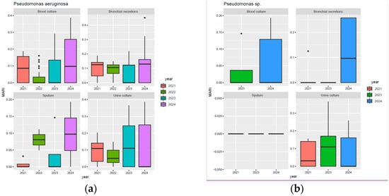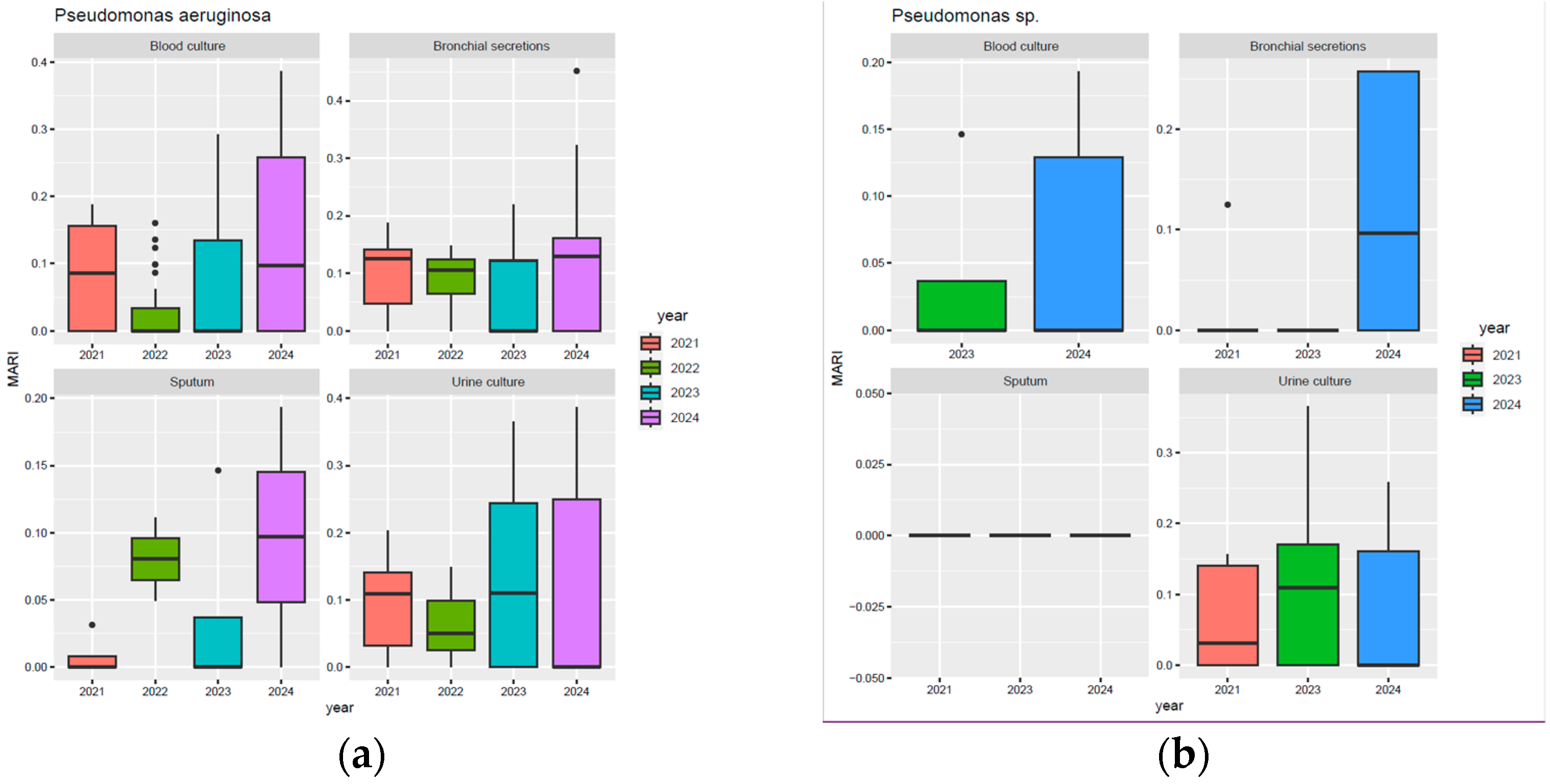 For Pseudomonas aeruginosa, the most significant increases in the MARI were observed in urine culture samples, where values increased significantly in 2023 and remained high in 2024, also exhibiting a high degree of variation. However, an upward trend can also be observed in sputum, with a progressive increase in the median MARI from 2021 to 2024. Similarly, in blood culture, increased variability was observed in 2023 and 2024, with maximum values exceeding 0.2, compared to 2021 and 2022, when MARI values remained below 0.2 (Figure 1a). On the other hand, for Pseudomonas spp., MARI values remained generally low across all types of samples. However, an increase in MARI can be observed for 2024 in isolates from blood cultures, bronchial secretions, and urinary cultures, although the values remained below those observed for P. aeruginosa (Figure 1b).