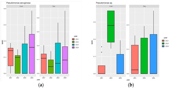 Annual evolution of the MARI in Pseudomonas aeruginosa and Pseudomonas spp. isolates collected from urine cultures, blood cultures, sputum, and bronchial secretions between 2021 and 2024; (a) distribution of MARI values for P. aeruginosa isolates; (b) distribution of MAR values for non-aeruginosa Pseudomonas spp. isolates.