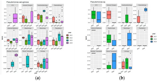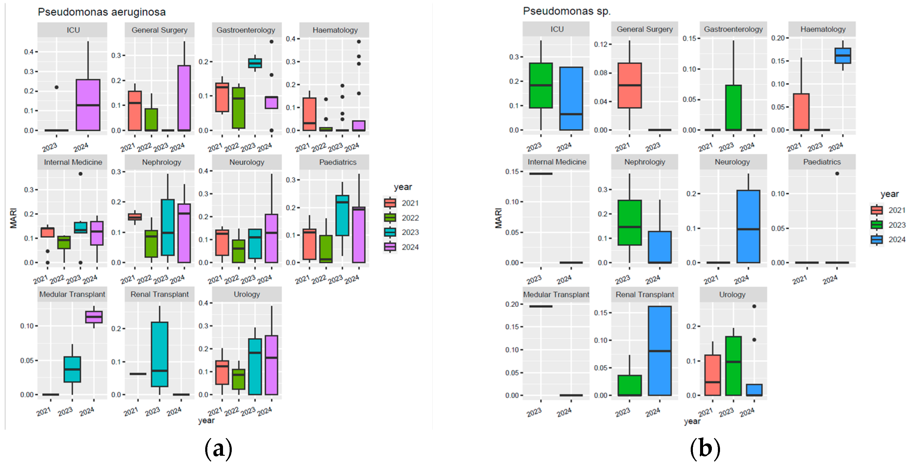 In 2024, Pseudomonas aeruginosa exhibited the highest MARI values in the ICU, Neurology, and Urology departments (median 0.15; extremes around 0.4) (Figure 3a). Most departments experienced a slight decrease from 2021 to 2022, followed by an increase through 2024, except Gastroenterology and Paediatrics, where a decline was noted between 2023 and 2024. For non-aeruginosa species, resistance generally declined in ICU, Surgery, Gastroenterology, Internal Medicine, Nephrology, Bone Marrow Transplant, and Urology. At the same time, Haematology, Neurology, and Renal Transplant displayed a marked increase in 2024 (Figure 3b).