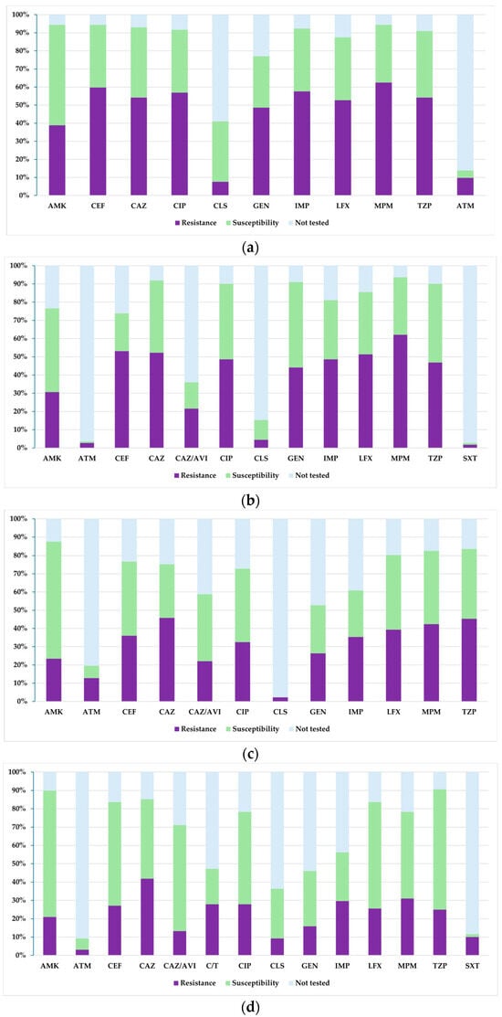 Antibiotic susceptibility profiles of Pseudomonas spp. isolates from 2021 to 2024: (a) 2021; (b) 2022; (c) 2023; (d) 2024. Legend: AMK—amikacin; ATM—aztreonam; CEF—cefepime; CAZ—ceftazidime; CAZ/AVI—ceftazidime–avibactam; C/T—ceftolozane–tazobactam; CIP—ciprofloxacin; CLS—colistin sulfate; GEN—gentamicin; IMP—imipenem; LFX—levofloxacin; MPM—meropenem; TZP—piperacillin–tazobactam; SXT—trimethoprim–sulfamethoxazole.