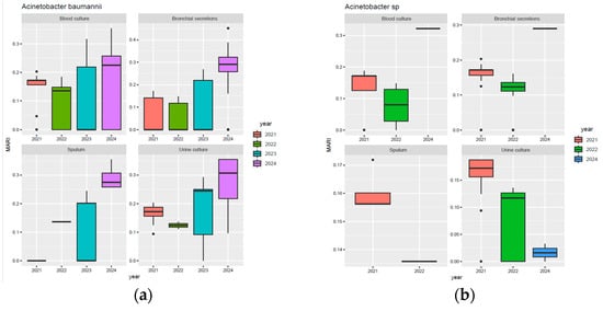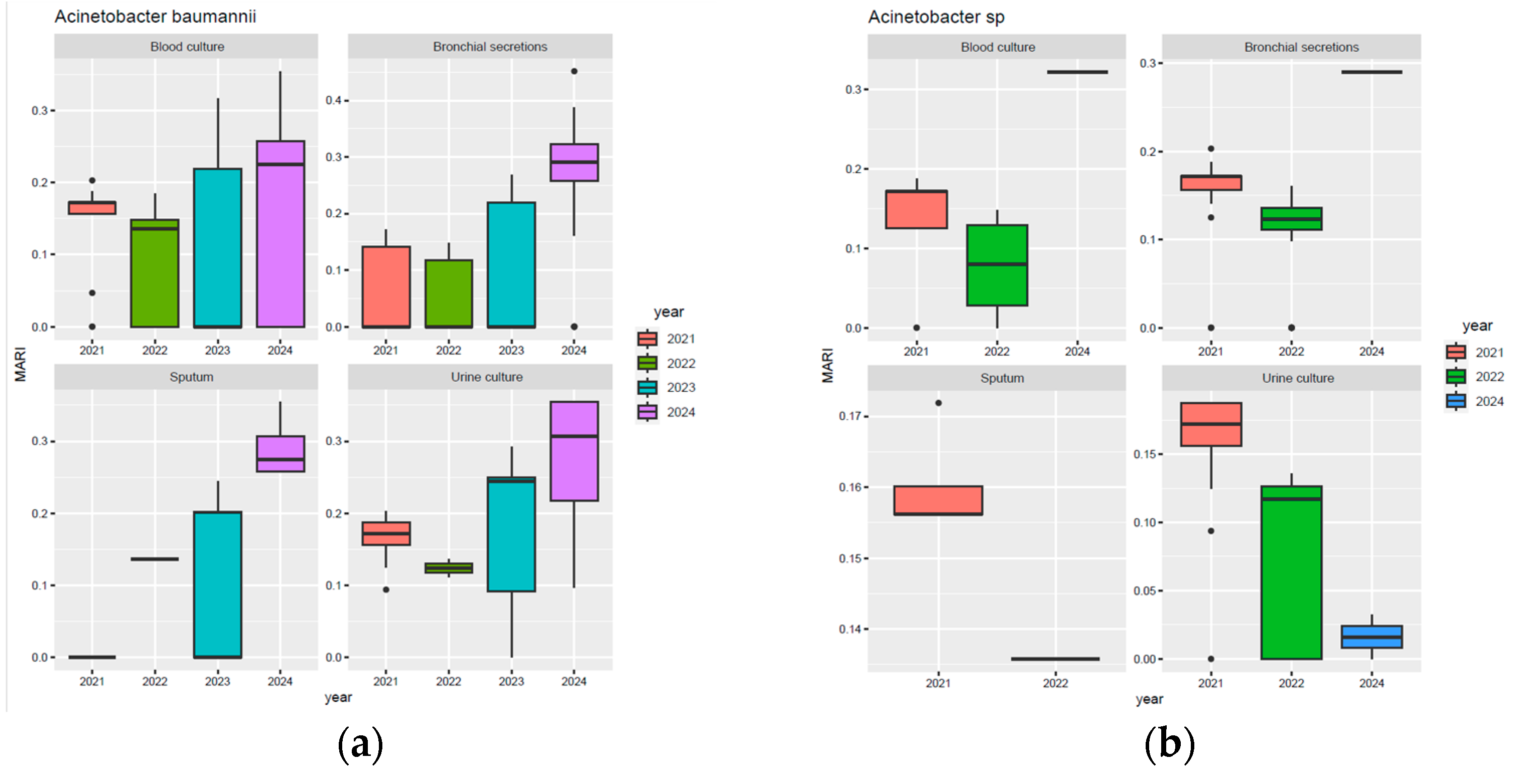 Regarding Acinetobacter baumannii (Figure 5a), MARI values in blood cultures increased steadily from 2021 to 2024, with the highest median MARI recorded in 2024. In bronchial secretions, a progressive increase is observed, with a peak in 2024, where the median MARI was close to 0.3; however, some values reached a MARI value of 0.45. In sputum and urine cultures, the median MARI also reached its highest values in 2024, approximately 0.26 and over 0.3, respectively. Regarding Acinetobacter spp., a median MARI value of roughly 0.30 was observed in blood cultures and bronchial secretions in 2024 (Figure 5b).