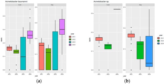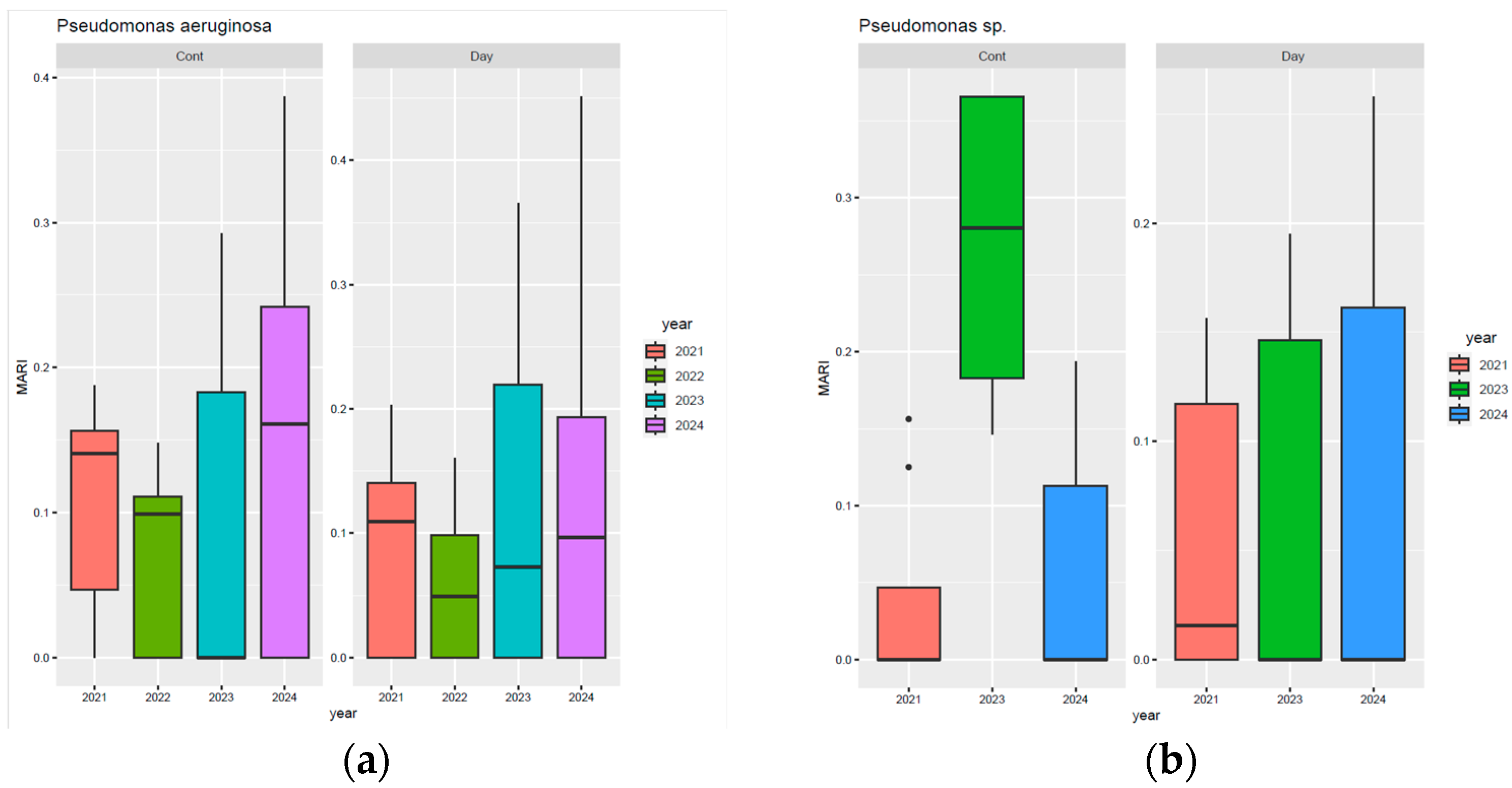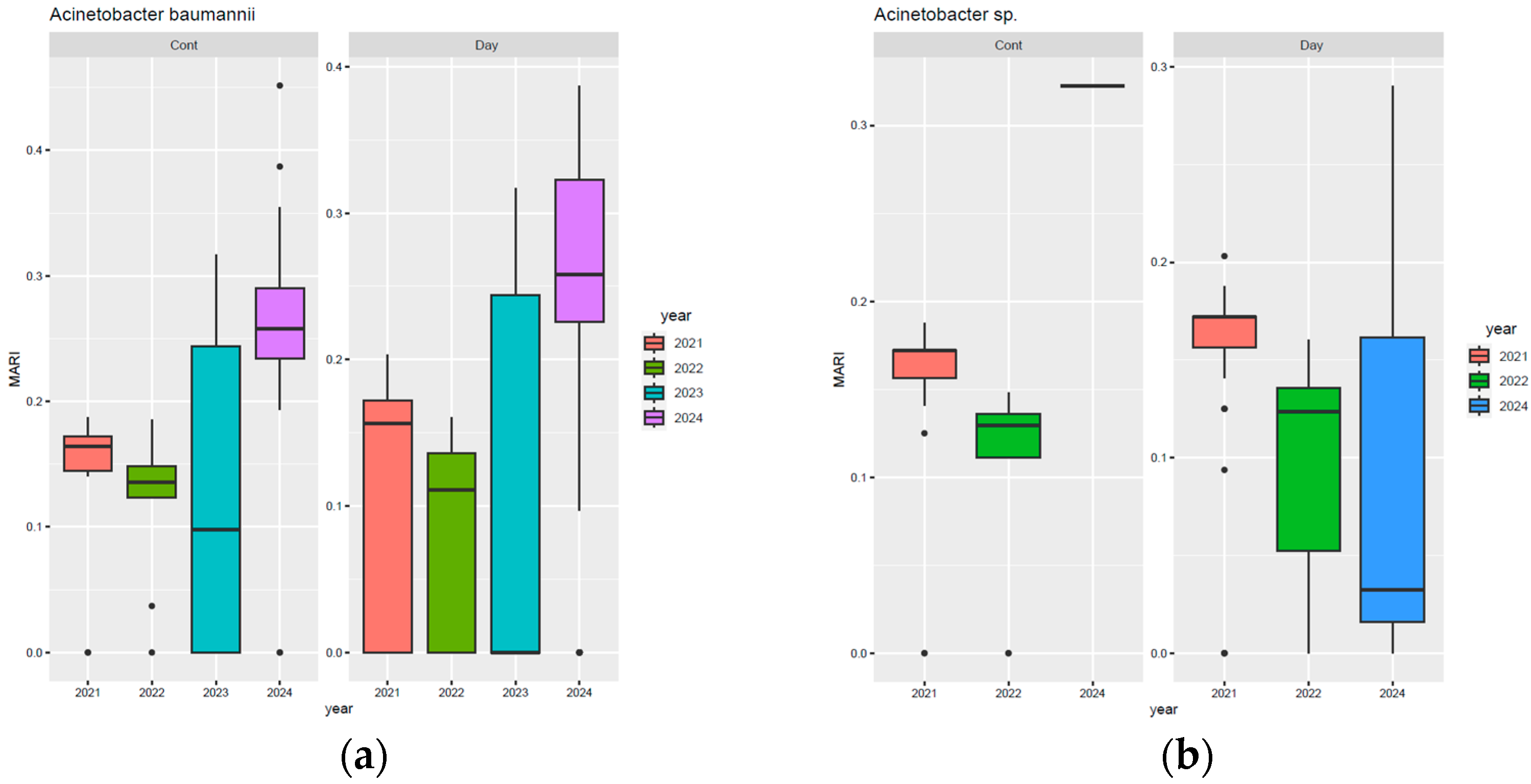 For Acinetobacter baumannii (Figure 6a), MARI values were stable in 2021–2022 (around 0.15), increased in variability in 2023, and rose sharply in 2024 (median around 0.26; extremes up to 0.45). Day hospital isolates followed the same upward trend, with greater variability and a 2024 median of 0.26. For Acinetobacter spp., continuous hospitalisations showed a median peak in 2024, while day hospitalisations displayed a progressive decline from 2021 to 2024, despite higher variability in the final year (Figure 6b).