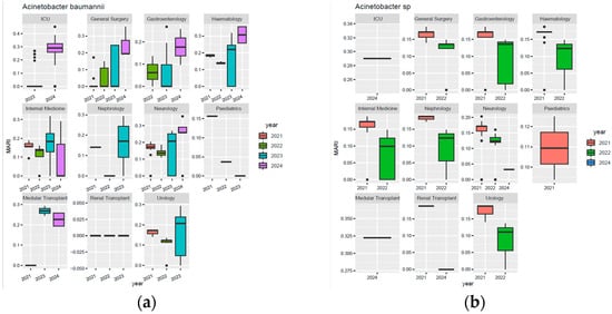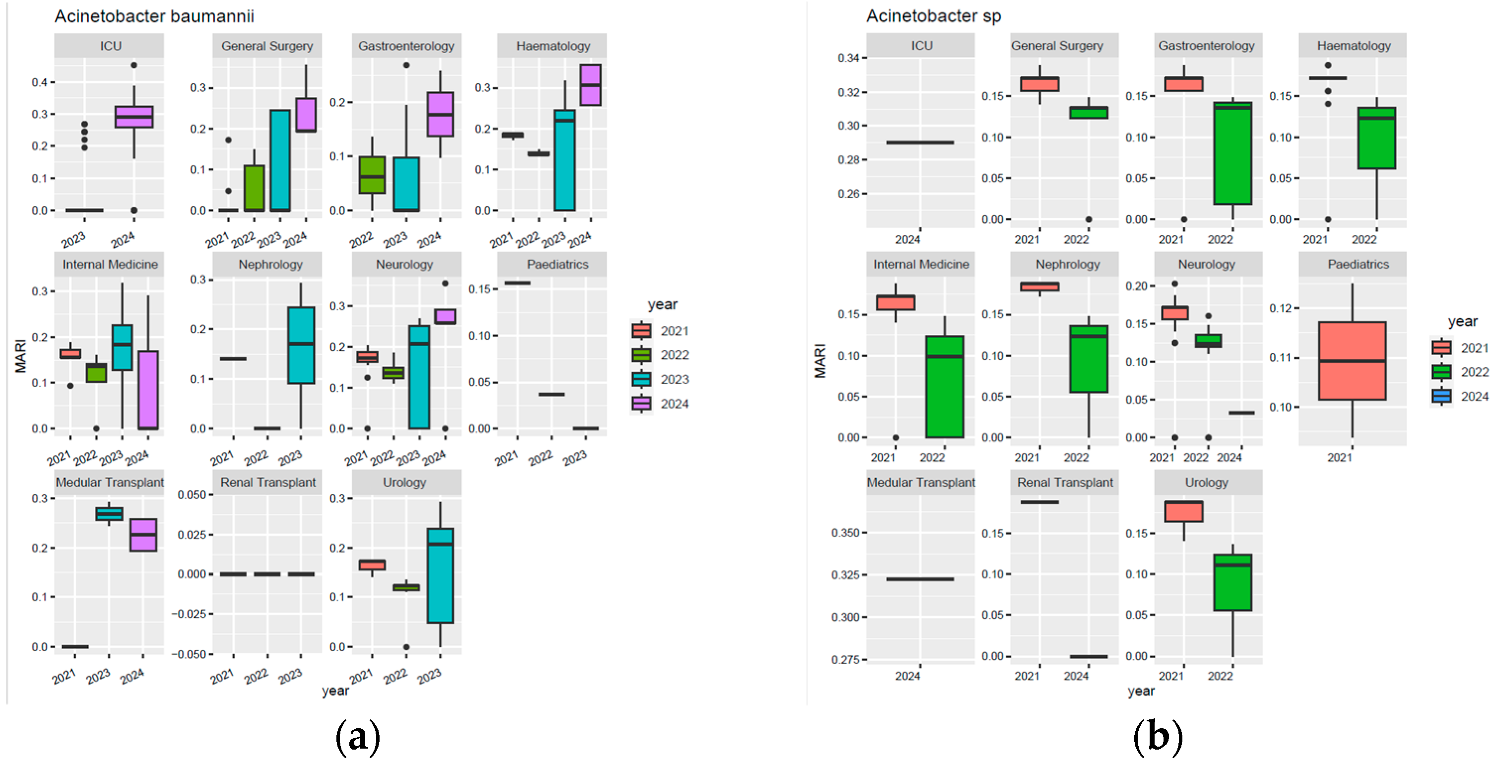 According to Figure 7a, the highest MARI values for Acinetobacter baumannii were observed in the ICU, Bone Marrow Transplant, and Neurology departments, especially in 2023–2024, with ICU values rising sharply in 2024 and Neurology reaching a median of 0.25. General Surgery also showed a progressive increase, with some values exceeding 0.3 in 2024, while Haematology and Gastroenterology recorded marked rises the same year. By contrast, Paediatrics and Renal Transplantation had very low or absent values. For Acinetobacter spp. (Figure 7b), the highest MARI was noted in 2021 in the ICU and Bone Marrow Transplant, with stable values in Nephrology and Internal Medicine, and a decrease in Neurology by 2024 to below 0.05.