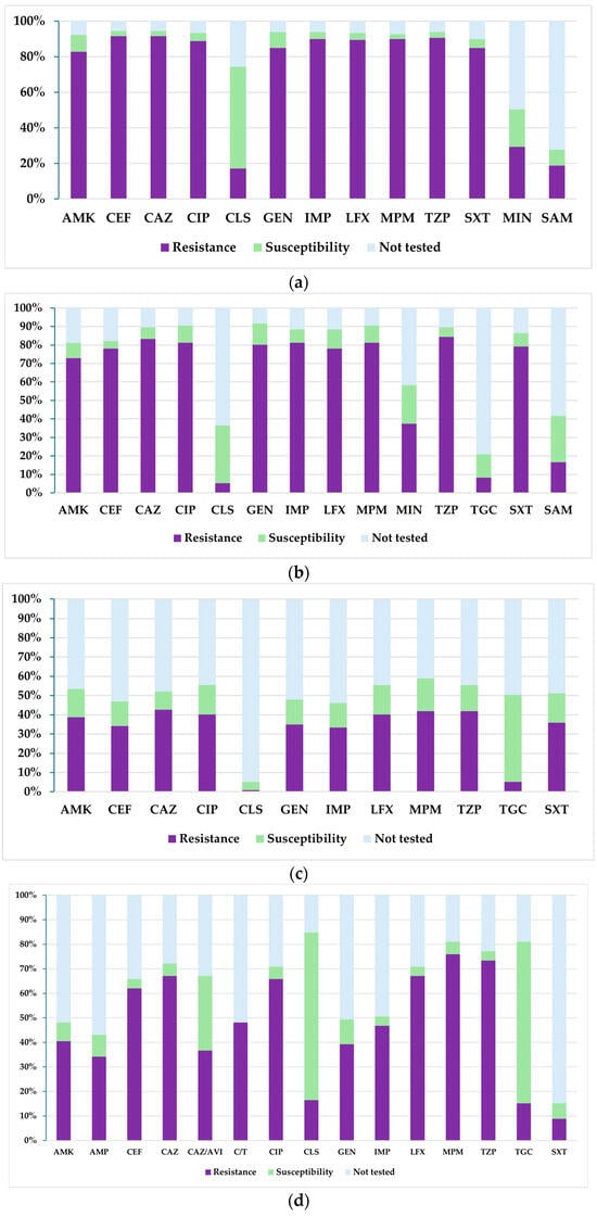 Antibiotic susceptibility profiles of Acinetobacter spp. isolates from 2021 to 2024: (a) 2021; (b) 2022; (c) 2023; (d) 2024. Legend: AMK—amikacin; CEF—cefepime; CAZ—ceftazidime; CIP—ciprofloxacin; CLS—colistin sulfate; GEN—gentamicin; IMP—imipenem; LFX—levofloxacin; MPM—meropenem; TZP—piperacillin–tazobactam; CXT—trimethoprim–sulfamethoxazole; MIN—minocycline; SAM—ampicillin–sulbactam; TGC—tigecycline.
