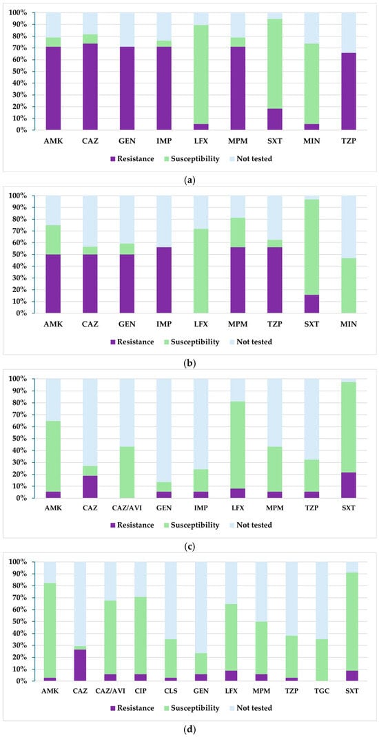 Antibiotic susceptibility profiles of Stenotrophomonas maltophilia isolates from 2021 to 2024: (a) 2021; (b) 2022; (c) 2023; (d) 2024. Legend: AMK—amikacin; CAZ—ceftazidime; CAZ/AVI—ceftazidime–avibactam; CIP—ciprofloxacin; CLS—colistin sulfate; GEN—gentamicin; IMP—imipenem; LFX—levofloxacin; MPM—meropenem; SXT—trimethoprim–sulfamethoxazole; MIN—minocycline; TZP—piperacillin–tazobactam; TGC—tigecycline.