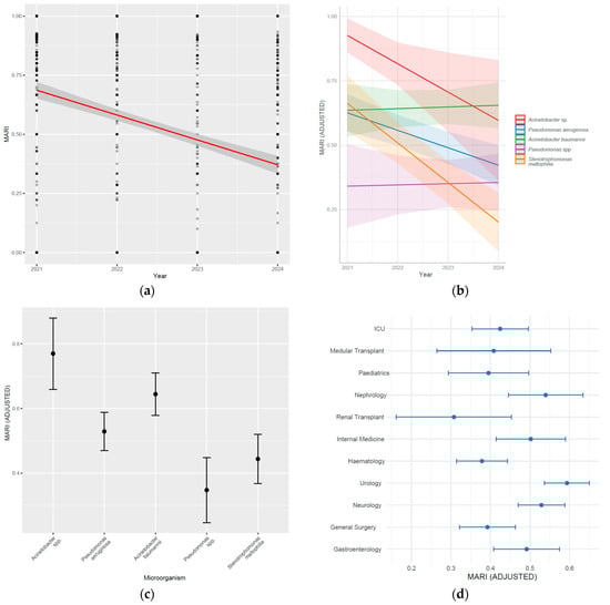 Evolution of the adjusted MARI as a function of time, pathogen, and hospital ward between 2021 and 2024. (a) Overall annual trend of the MARI (2021–2024), estimated on all bacterial isolates in the study; (b) annual evolution of the adjusted MARI for each selected bacterial species; (c) adjusted mean values of the MARI for each pathogen, regardless of year; (d) adjusted mean values of the MARI for the hospital wards.