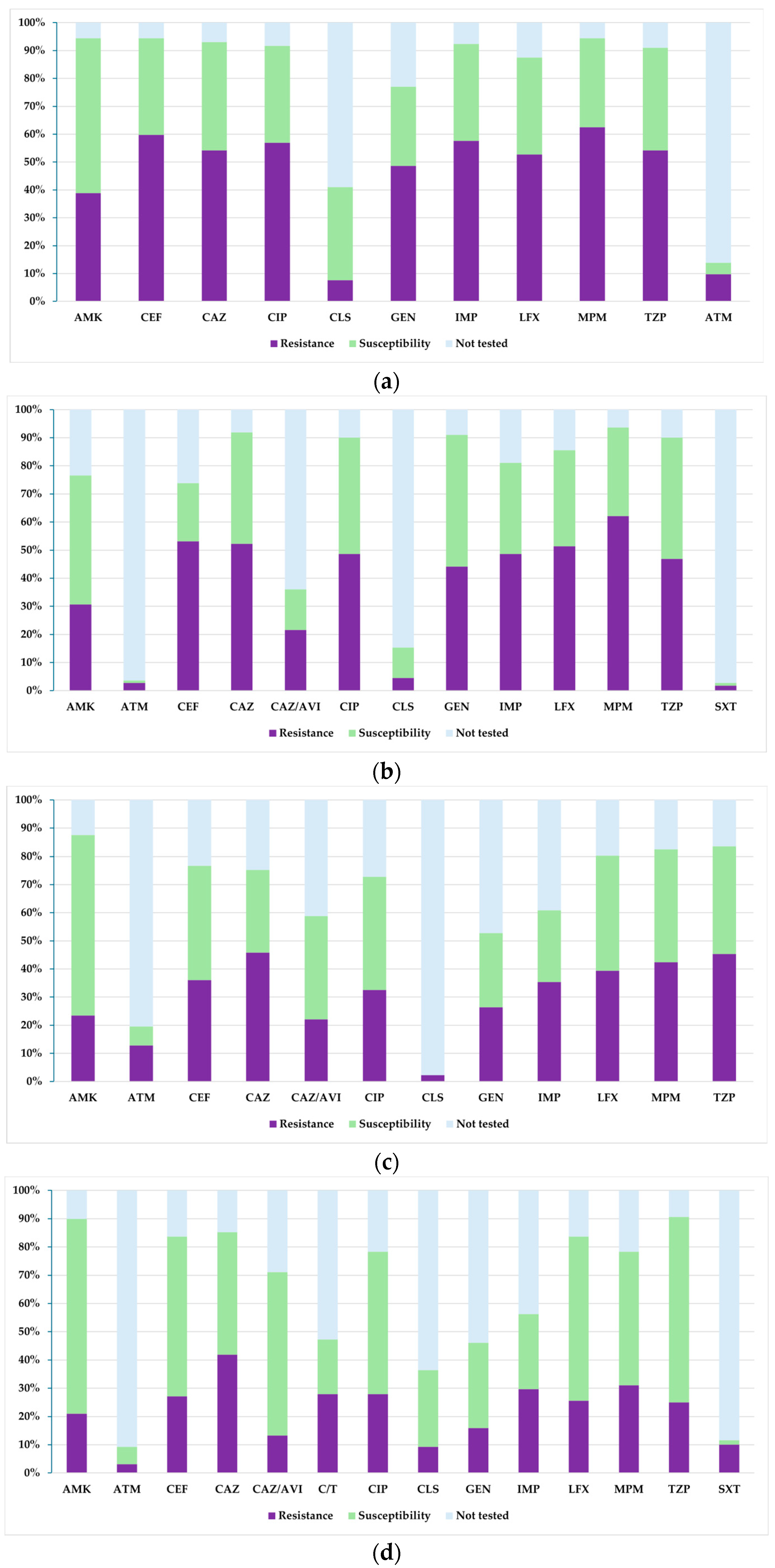 The number and type of antibiotics tested varied depending on the isolated species, hospital-specific protocols, and the availability of test kits in the years analysed. Additionally, in some cases, certain molecules were replaced with pharmacologically equivalent alternatives or omitted from the antibiogram if they were not relevant to the specific infection.