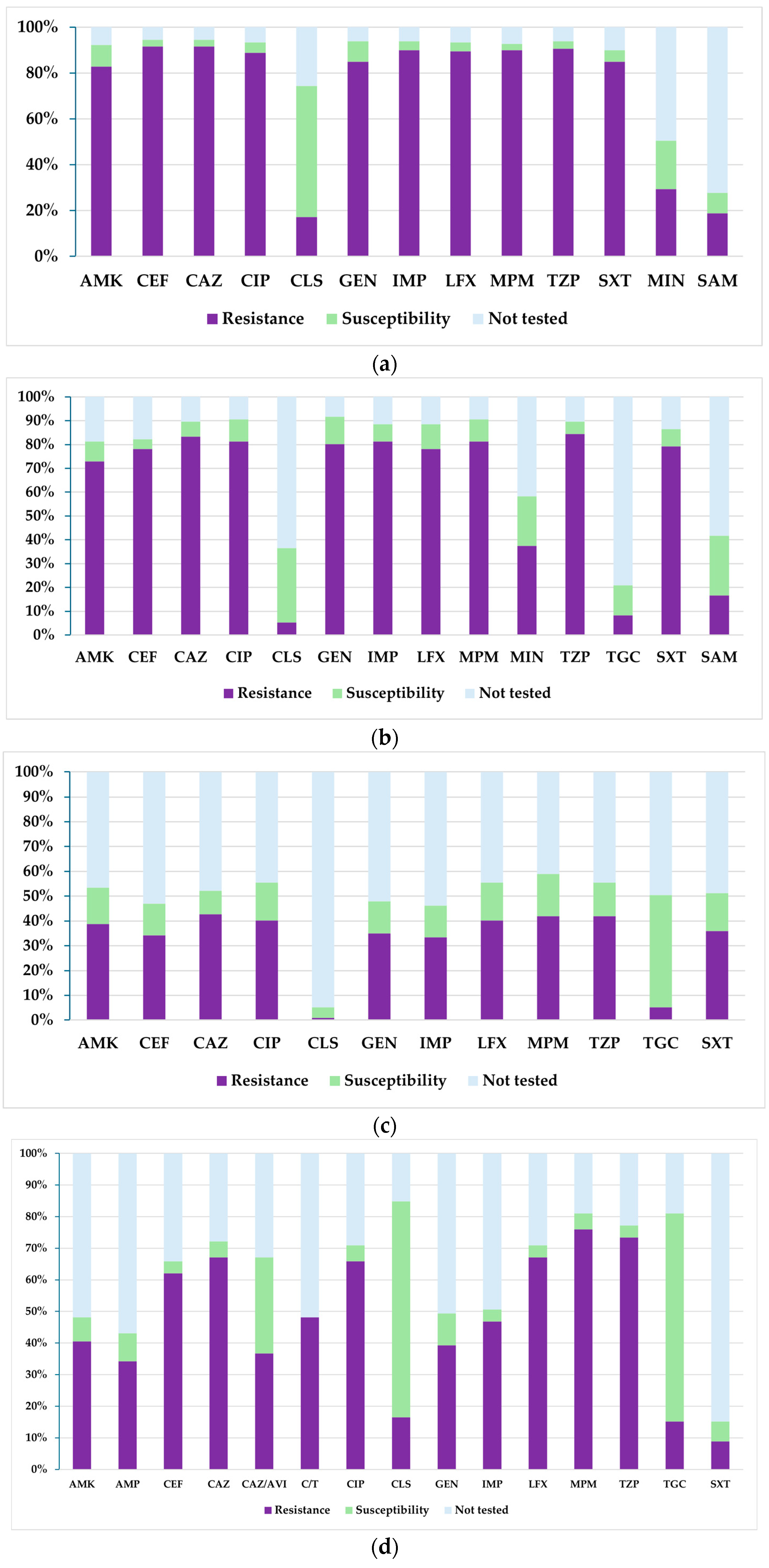 Figure 8. Antibiotic susceptibility profiles of Acinetobacter spp. isolates from 2021 to 2024: (a) 2021; (b) 2022; (c) 2023; (d) 2024. Legend: AMK—amikacin; CEF—cefepime; CAZ—ceftazidime; CIP—ciprofloxacin; CLS—colistin sulfate; GEN—gentamicin; IMP—imipenem; LFX—levofloxacin; MPM—meropenem; TZP—piperacillin–tazobactam; CXT—trimethoprim–sulfamethoxazole; MIN—minocycline; SAM—ampicillin–sulbactam; TGC—tigecycline.