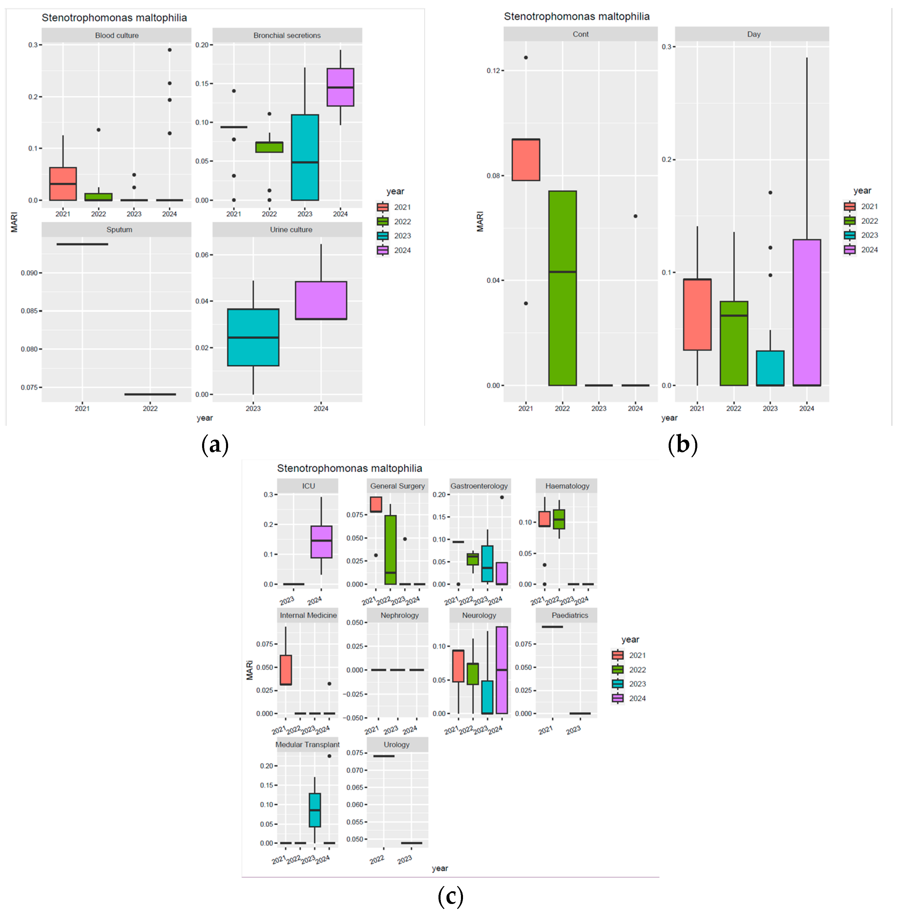 Figure 9 illustrates the MARI values for Stenotrophomonas maltophilia isolates. In bronchial secretions, a slight decrease in the median MARI value was observed from 2021 to 2023. It is worth noting that in 2023, high variability was observed, with extreme values reaching nearly 0.15. In 2024, a sharp increase in the median MARI to 0.15 was observed, with extreme values close to 0.2. Similarly, in urine cultures, an upward trend was observed between 2023 and 2024, but with lower values than in bronchial secretions; extreme values in 2024 reached approximately 0.2 (Figure 9a). Moreover, in continuous hospitalisations, although a peak in the resistance of this pathogen was identified in 2021, in 2023 and 2024, a median MARI value close to 0 was observed. In contrast, day hospitalisations show a downward trend from 2021 to 2023, but a marked increase in variability and extreme values in 2024, reaching almost 0.3 (Figure 9b). Additionally, it can be observed that the departments with the highest MARI values in 2024 were ICU and Neurology. In the departments of General Surgery, Gastroenterology, Haematology, Internal Medicine, and Urology, downward trends were observed during the analysed period (Figure 9c).