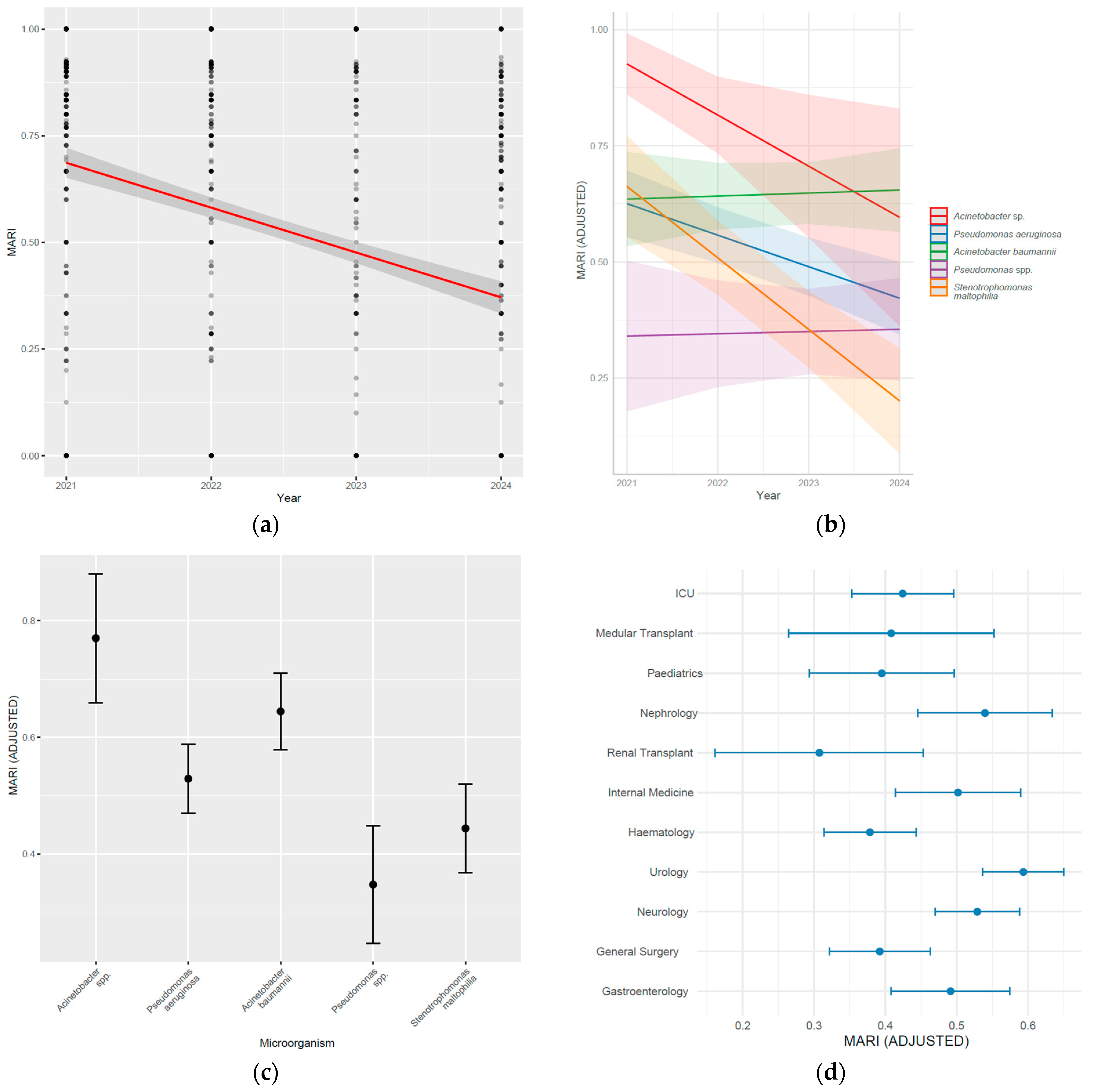 Figure 11. Evolution of the adjusted MARI as a function of time, pathogen, and hospital ward between 2021 and 2024. (a) Overall annual trend of the MARI (2021–2024), estimated on all bacterial isolates in the study; (b) annual evolution of the adjusted MARI for each selected bacterial species; (c) adjusted mean values of the MARI for each pathogen, regardless of year; (d) adjusted mean values of the MARI for the hospital wards.