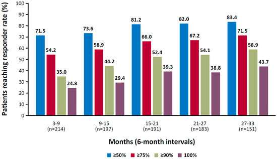 Cenobamate, an inhibitor of voltage-gated sodium currents and a positive allosteric modulator of GABA-A receptors, has exhibited long-term efficacy in controlling seizures [120,132,133]. In a randomized, placebo-controlled trial of adult patients with focal seizures, the median percent change in seizure frequency during the 18-week treatment period was 55% in the 200 mg and 400 mg cenobamate groups compared with 24% in the placebo group (p < 0.001) [120]. In a long-term, open-label study, rates of participants who achieved seizure freedom during consecutive 6-month intervals increased over time, from 25% during months 3 to 9 to 44% during months 27 to 33 (median dose at month 33, 300 mg; Figure 1) [121].