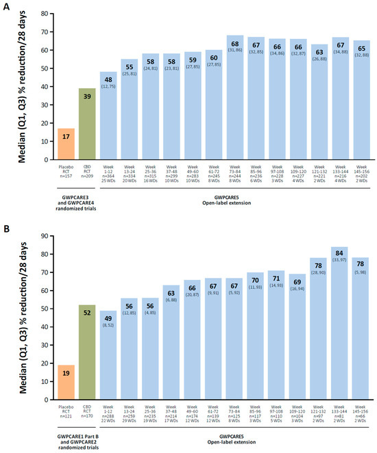 There is a wide variety of molecular targets for cannabidiol, including nonselective ion channels (transient-receptor potential channels), voltage-gated sodium channels, potassium channels, G protein–coupled receptor 55, and 5-HT receptors [134]. In a long-term OLE study of cannabidiol oral solution in patients with Lennox–Gastaut syndrome, the median percent reduction in total seizures increased over time, from 48% at weeks 1 to 12 to 65% at weeks 145 to 156 (mean modal dose, 24 mg/kg/d; Figure 2A) [122]. In a long-term OLE in patients with Dravet syndrome, the median percent reduction in total seizures increased from 49% at weeks 1 to 12 to 78% at weeks 145 to 156 (mean modal dose, 22 mg/kg/d; Figure 2B) [123].