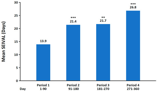 A post hoc analysis of the phase 3 study in patients aged 6 to 65 years was conducted to examine the duration (in days) between treated seizure clusters (seizure interval [SEIVAL]) over time [128]. SEIVAL was assessed using 90-day periods, as this period length would allow for the inclusion of a sufficient number of patients with an assessable SEIVAL for each period; four 90-day periods approximated the study’s 365-day treatment period. In the analysis of patients with SEIVALs in each of the four 90-day periods (second doses excluded [i.e., excluding retreatment of a seizure cluster within 24 h]), mean SEIVAL increased from 13.9 days in Period 1 to 26.8 days in Period 4 (p ≤ 0.001; Figure 3). The increase in SEIVAL was independent of age, duration of exposure, and change in concomitant medications. This was consistent with results for the overall study population, which included variable cohorts for each period [128]. Similar results were observed regardless of sex, whether the medication was self-administered or administered by a caregiver, or the presence of developmental epileptic encephalopathies [140,141].