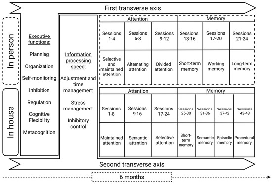 The detailed structure of the neurorehabilitation intervention was as follows: attention was the first symptom that was intervened with, in its different modalities as sustained, selective, alternating and divided. Next, short-term, long-term, working, semantic, episodic and procedural memory at the codification, storage and evocation stages was intervened with. The two transversal axis were implemented in order to increase the attentional devices and the relationship between memory and executive functional processes, strengthening the employment and maintenance of cognitive strategies, as well as regulation and response time management, monitoring inhibitory control and stress (Figure 1).