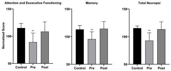 Normalized scores obtained in the Neuropsi Atención y Memoria III test comparing the control group and the experimental group pre- and post-neurorehabilitation (** p < 0.01).