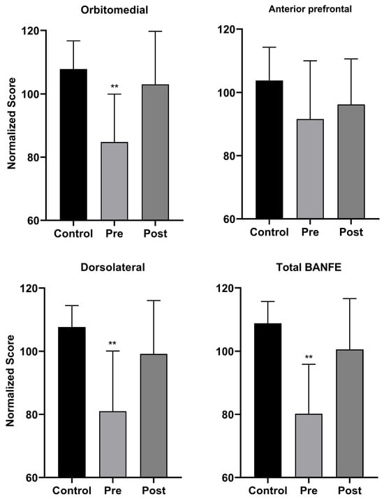 As above, at the end of the neurorehabilitation, BANFE-III was reapplied in the experimental group in order to evaluate the effect of the intervention. A significant increase was found in the normalized scores of both the Orbitomedial (p < 0.01) and Dorsolateral (p < 0.01) components and in the total normalized scores of the BANFE-III test (p < 0.01) (Figure 3). When comparing the post-neurorehabilitation scores for the anterior prefrontal cortex in the experimental group and the scores in the control group, no significant differences were found.