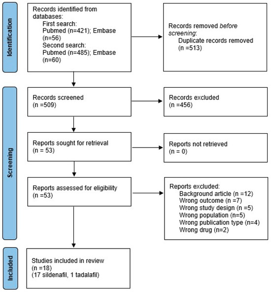 The flow diagram of the systematic search is shown in Figure 1. Finally, 18 studies were included in the systematic review [21,22,23,24,25,26,27,46,47,48,49,50,51,52,53,54,55,56]. The characteristics of the included studies are summarized in Table 1. Of the 18 included studies, 17 used sildenafil [21,22,23,24,25,26,27,46,47,48,49,50,51,52,53,54,55] and one used tadalafil [56]. Therefore, tadalafil could not be included in a meta-analysis as only one study was available. Two of the 17 sildenafil studies included two temporal schedules (early and late sildenafil) [49,55]. As a result, a total of 19 experimental settings were included in the meta-analysis. The nitrofen model was used in 14 studies (12 in rat and 2 in mouse) [21,22,23,24,25,46,48,49,50,51,52,53,54,55] and the surgical CDH model was used in 4 studies (2 in rabbit and 2 in lamb) [26,27,47,56]. No studies were found on the use of sildenafil in genetic models of CDH.
