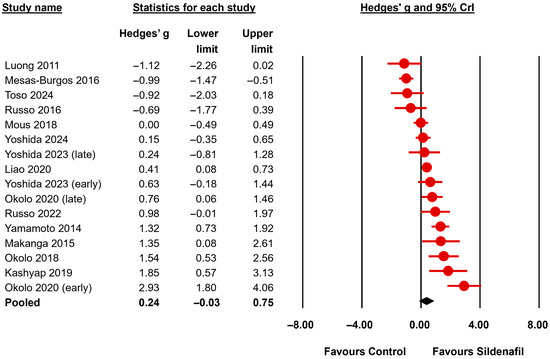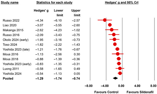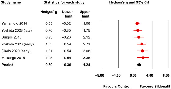 A meta-analysis could not be conducted for tadalafil because only one study investigated this drug [56]. That study showed that tadalafil did not induce statistically significant changes (p > 0.05) in either LBWR or RV/LV + S. However, tadalafil induced a significant increase in pulmonary eNOS expression in comparison to placebo (p < 0.001) [56].