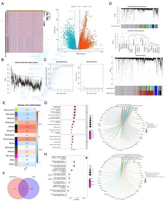 Differentially expressed genes and intersected genes. (A) Heatmap (left) and volcano plot (right) of differentially expressed genes (DEGs). In the heatmap, red indicates high expression and blue indicates low expression. (B) Sample clustering of the dataset samples. The x-axis represents samples, and the y-axis, “Height”, represents the differential distance between samples (reflecting the dissimilarity of expression patterns/data characteristics). (C) Determination of the power threshold. Left panel: Relationship between soft threshold (power) and scale-free network fitness (Scale Free Topology Model Fit, R2). The numbers represent different R2 values. Right panel: Relationship between soft threshold and mean connectivity. The numbers represent different soft thresholds. (D) Construction of co-expression matrix. Top left: Dynamic cutting tree of modules. Top right: Clustering tree for merging similar modules. Bottom left: Dynamic cutting tree for merging similar modules. Different colors represent different clustering modules. (E) Gene set variation analysis score correlation heat map. Left panel: Co-expression modules identified by weighted gene co-expression network analysis (WGCNA). Right panel: The color and numerical values of the color blocks represent the correlation coefficients between modules and phenotypic traits (score) (p values are in parentheses). Red indicates a positive correlation, and blue indicates a negative correlation. (F) Venn diagram of module genes and differentially expressed genes. (G) Gene ontology (GO) enrichment analysis of intersected genes. Left panel: GO bubble plot. The y-axis represents enriched GO terms, and the x-axis, “GeneRatio”, refers to the proportion of enriched genes in the target gene set. The size of the bubbles corresponds to “Count” (number of enriched genes), and the color represents “p.adjust” (adjusted p-value; smaller values indicate higher significance). Right panel: Gene-GO term network diagram, where gray dots represent genes and yellow dots represent GO terms. (H) Kyoto Encyclopedia of Genes and Genomes (KEGG) enrichment analysis of intersected genes. Left panel: KEGG bubble plot. Right panel: Gene-KEGG pathway network diagram.