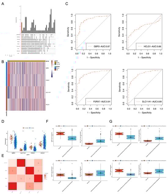 Selection of critical genes and functional annotation analysis of them. (A) Selection of critical genes through ten algorithms. The upper bar chart shows the size of the intersection of the top 40 genes ranked by 10 network topology scoring algorithms, with red representing the number of intersection genes among the top 40 genes from all algorithms. The numbers on the bars represent the number of overlapping genes in different sets. (B) Heat map of the expression of critical genes in each sample. (C) Receiver operating characteristic curves of P2RX7, SLC11A1, GBP2, and HCLS1 in the Cancer Genome Atlas-EC dataset. The x-axis represents the false positive rate (1-Specificity), and the y-axis represents the true positive rate (Sensitivity). The dashed line denotes the ROC curve corresponding to the HCLS1 gene, with AUC being the area under the curve. (D) Expression of critical genes between tumor and normal samples in the Cancer Genome Atlas-EC dataset (** p < 0.01, **** p < 0.001). (E) Correlation heatmap of the critical genes. The redder the color, the stronger the positive correlation (*** p < 0.001). (F) Differential expression of the critical genes between the “Adenomas and Adenocarcinomas” subtype group and the normal group (** p < 0.01, **** p < 0.001). Black circles represent the expression levels of genes in individual samples. (G) Differential expression of the critical genes between the “Cystic, Mucinous and Serous Neoplasms” subtype group and the normal group. (**** p < 0.001). Black circles represent the expression levels of genes in individual samples.
