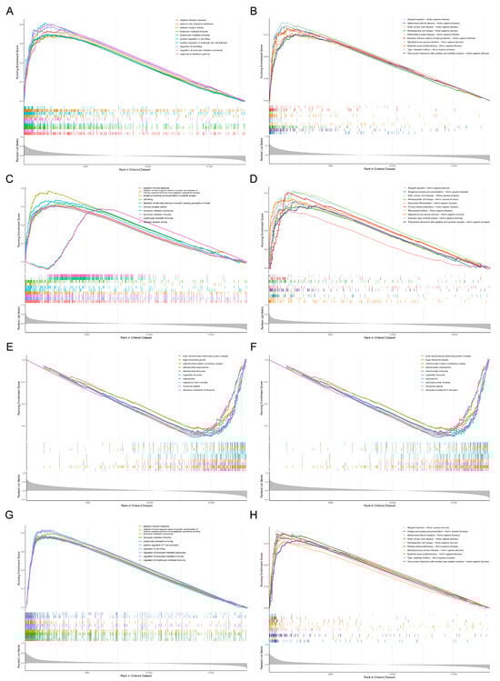 (A) GSEA GO results of GBP2. The enrichment curves of mitochondria- and ribosome-related gene sets are displayed. The x-axis represents the rank of genes in the ordered dataset (Rank in Ordered Dataset), and the y-axis represents the running enrichment score (Running Enrichment Score). The colored vertical lines in the middle indicate the distribution positions of genes in the gene sets. The gray curve at the bottom shows the background distribution trend of gene set enrichment, which is used to evaluate the significance of gene set enrichment in biological processes. (B) GSEA GO results of HCLS1. (C) GSEA GO results of P2RX7. (D) GSEA GO results of SLC11A1. (E) GSEA KEGG results of GBP2. (F) GSEA KEGG results of HCLS1. (G) GSEA KEGG results of P2RX7. (H) GSEA KEGG results of SLC11A1.