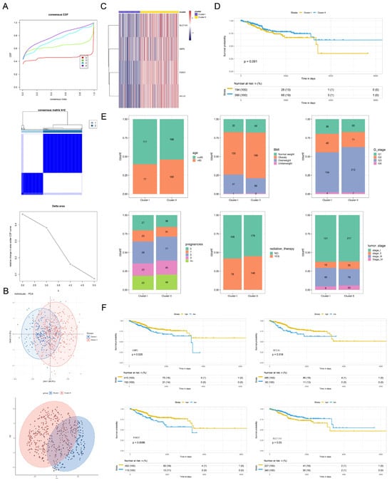 Cluster classification of EC samples and predictive ability of critical genes. (A) Consensus clustering analysis. (Upper): Comparison plot of cumulative distribution functions (CDF) for continuous value distributions. The x-axis represents continuous values, and the y-axis represents cumulative distribution probabilities (CDF). Curves of different colors correspond to different group sizes. (Middle): Visualization of the consensus matrix heatmap, where the color intensity reflects the degree of clustering consistency. (Lower): Area under the CDF curve plot for consensus clustering. The x-axis represents k values, and the y-axis represents Delta area index values, which reflect the quantitative results of clustering stability or structural differences with changes in k values and are used to determine the optimal clustering k value. (B) Principal component analysis (PCA) and t-distributed stochastic neighbor (t-SNE) embedding analysis. The PCA plot shows the distribution of samples in the two clusters, reflecting the distinguishability and population structure between different clusters. The t-SNE plot displays the distribution of samples in the two clusters, analyzing the tightness within different clusters and the distinguishability between subtypes. (C) Heat map of the expression of critical genes in each sample of clusters. (D) Kaplan–Meier curves of two clusters. (E) Differences in clinical characteristics (stage, tumor stage, age, body mass index, radiation therapy, and pregnancies) between cluster 1 and cluster 2. (F) Kaplan–Meier curves of GBP2, SLC11A1, P2RX7, and HCLS1 between high/low expression groups.