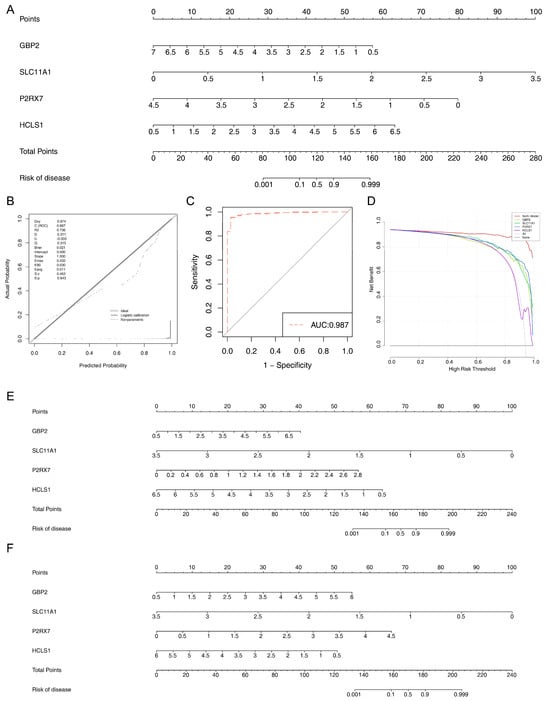 (A) EC risk prediction nomogram. It shows the risk score contribution (points dimension) of 4 key genes, namely GBP2, SLC11A1, P2RX7, and HCLS1. The “Total Points” below summarizes the total risk score, and the “Risk of disease” at the bottom presents the corresponding distribution of disease risk probability, which is used to quantify the predictive effect of the key gene combination on the risk of endometrial cancer onset. (B) Calibration curve. The x-axis represents the predicted probability, and the y-axis represents the actual probability. It shows the fitting of logistic calibration (solid line), non-parametric (dashed line), and ideal calibration (gray). Model evaluation indicators (Dxy, C (ROC), etc.) are listed in the upper right corner, which is used to verify the consistency between the predicted probability of the model and the actual probability of disease occurrence. (C) ROC curve of EC risk prediction nomogram. (D) Decision curve analysis curves of different models. It shows the changing trends of survival rates with the adjustment of high-risk thresholds when individual key genes and the nomogram model are used as risk indicators for EC. It is used to screen the optimal critical value for risk stratification and assist in disease prognosis evaluation and risk grouping decisions. (E) Nomogram for the “Adenomas and Adenocarcinomas” subtype. (F) Nomogram for the “Cystic, Mucinous and Serous Neoplasms” subtype.