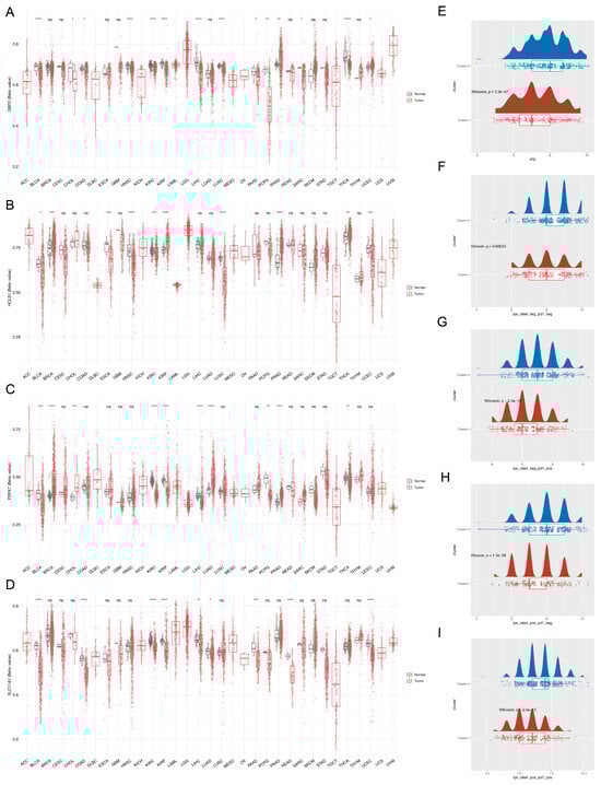 Analysis of CpG methylation and response to immunotherapy. (A–D) Differences in methylation changes in GBP2, HCLS1, P2RX7, and SLC11A1 between tumor and normal samples. (E–I) Differences in immunotherapy scores of PD-1, PD-L1, and CTLA-4 between the two clusters of EC patients (* p < 0.05, ** p < 0.01, *** p < 0.001, **** p < 0.001, ns p > 0.05).