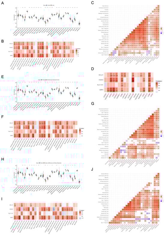 Immunity microenvironment analysis (* p < 0.05, ** p < 0.01, *** p < 0.001, **** p < 0.001). (A) Differences in immune cell infiltration abundance between tumor and normal samples (B) Correlations between critical genes and immune cells. (C) Correlations among immune cells. (D) Correlations between critical genes and immune checkpoints. (E) Differences in immune cell composition between the “Adenomas and Adenocarcinomas” subtype and the normal group. (F) Correlation heatmap between immune cells and critical genes: the redder the color, the stronger the positive correlation; the bluer the color, the stronger the negative correlation. (G) Correlations among immune cells. (H) Differences in immune cell composition between the “Cystic, Mucinous and Serous Neoplasms” subtype and the normal group. (I) Correlation heatmap between immune cells and critical genes: the redder the color, the stronger the positive correlation; the bluer the color, the stronger the negative correlation. (J) Correlations among immune cells.