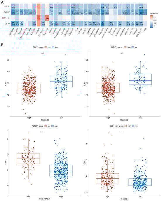Through Spearman’s correlation analysis, we found the highest passive correlation of HCLS1 (Cor = −0.41, p < 0.001) and GBP2 (Cor = −0.52, p < 0.001) with “Ribociclib”, as well as P2RX7 with “BMS.754807” (Cor = −0.55, p < 0.001). Whereas SLC11A1 was the most strongly positively connected with “BI.2536” (Cor = 0.39, p < 0.001) (Figure 8A). In addition, the IC50 of these drugs were all notably different between related critical genes high/low expression groups (p < 0.0001) (Figure 8B). The patients with high expression of HCLS1, GBP2, and P2RX7 were more susceptible to “Ribociclib” and “BMS.754807”, while patients with high expression of SLC11A1 were more tolerant of “BI.2536”.