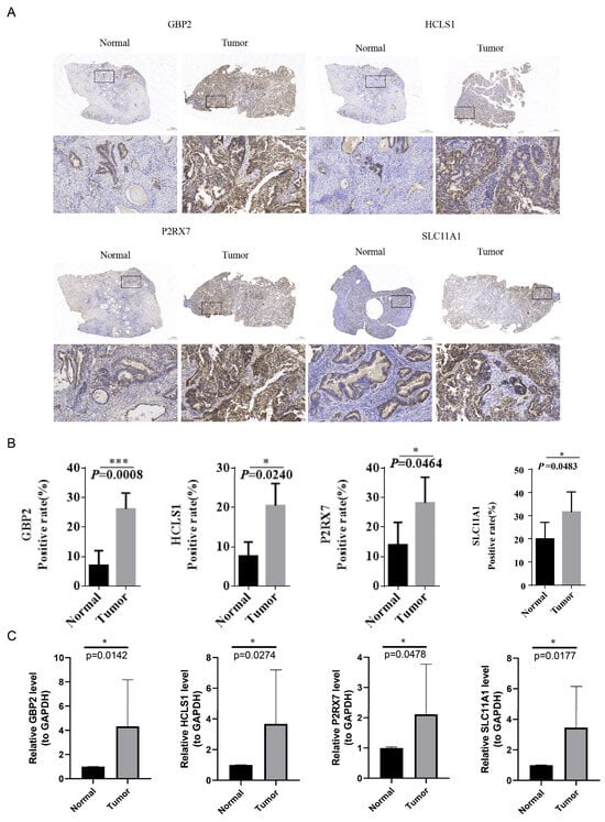 The results of immunochemistry showed that GBP2, HCLS1, P2RX7, and SLC11A1 were more highly expressed in the tumor group than in the normal group (Figure 9A,B). The results of qRT-PCR showed that these four critical genes were significantly up-regulated in the tumor group compared to the normal group (Figure 9C). Generally, the expression trends of these genes were consistent with the result of bioinformatic analysis.
