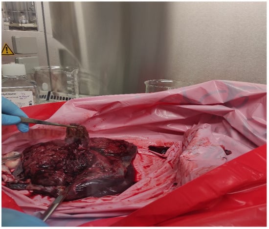 In a Class II safety cabinet, placental tissue was rinsed three times using 20 mL of sterile PBS (Phosphate-Buffered Saline, Gibco, Grand Island, NY, USA) per rinse to remove blood and contaminants. Each washing step lasted 5 min with gentle shaking. The placenta was dissected into 1 cm2 pieces using sterile surgical scissors.